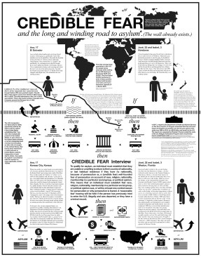 She’s asking this latest question in the context of a very specific project, an asylum map that she’s created in collaboration with the American Civil Liberties Union (ACLU) and that is being disseminated now, through posters and PDFs and a variety of other channels, in order to explain, in impressive detail, how asylum requests work. The centerpiece of asylum: the idea of “credible fear,” i.e. the idea that the reason compelling a refugee to seek assistance from another country is in fact a legitimate risk. “This whole discussion of the wall or the fence—it already exists,” Carroll told me, referring to the difficulty of gaining asylum. “And people have sort of alluded to that [existence], but no one’s explicitly stated and shown what the process is.”