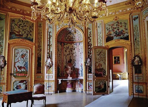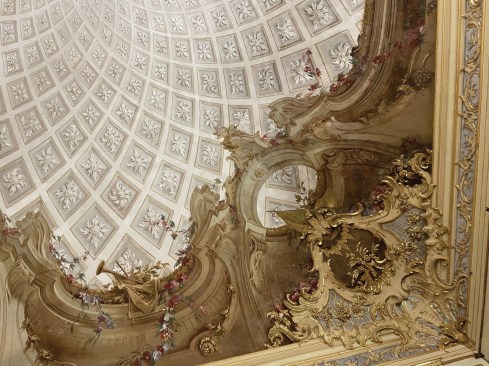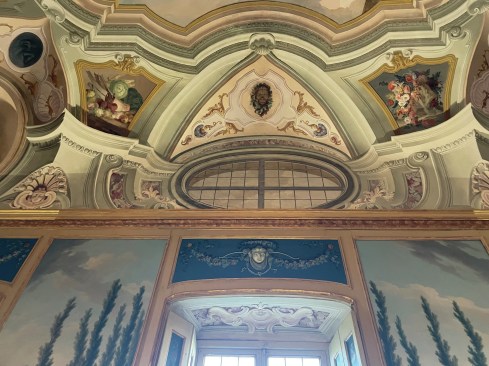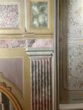 You can tell some of the later decorations, all the way up through work done when one of Napoleon’s vassals was in charge there and later, more sober dynasts, apart because it tended to rely more on geometric effects, including trompe l’oeil grids swirling into corkscrew distortions of domes as well as more placid evocations of windows that are not really there. Other decorators were even more modest, whether in just faking the marble on the plaster columns or drawing precise versions of the flowers you could find in the surrounding forests and fields.