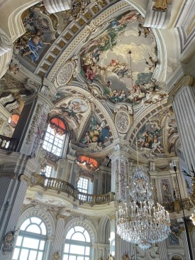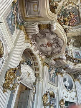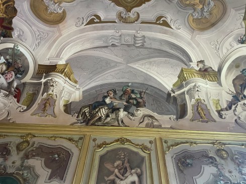 What I was not expecting was the degree to which the decorators Juvarra and his former employee and successor (the first of many who enlarged and enhanced the original), Giovanni Tommaso Prunotto, assembled ran riot across that already complex layout. The first generation of painters were apparently almost all Venetian, bringing with them the ability to dissolve surfaces into expanses of sky, landscapes, and classical architecture populated by people and animals gamboling through these fictional expanses.