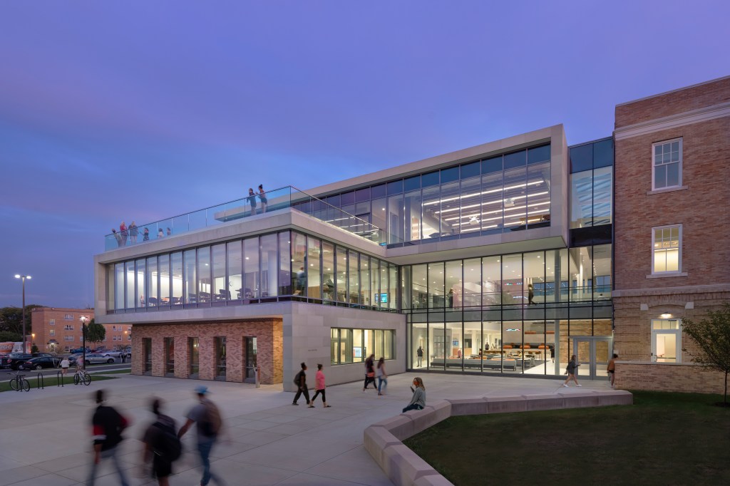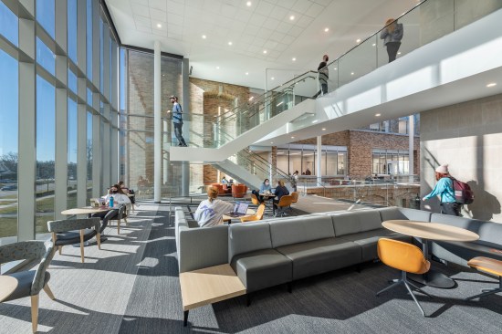 The Bowling Green State University was founded as a normal school—a place where early 20th-century high school graduates in Ohio were taught to teach. Today, the public university has more than 20,000 students on its campus, located about 15 miles south of Toledo. The latest sign of Bowling Green’s impressive growth comes with the newly opened Maurer Center, which houses the Allen W. and Carol M. Schmidthorst College of Business. The project included the renovation of Hanna Hall, one of the school’s earliest buildings, located on its original quad, and a 50,000-square-foot addition designed by the Chicago office of Perkins&Will, in collaboration with local firm the Collaborative.