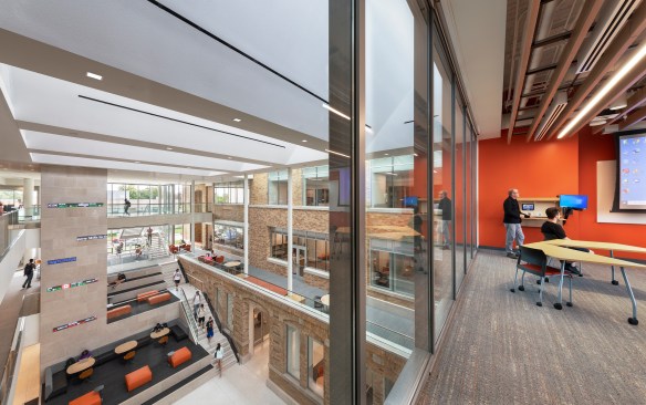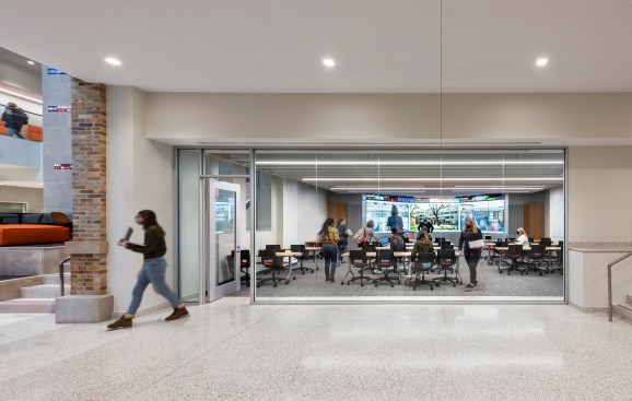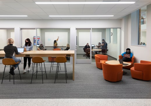 P&W design principal Joe Connell says that the business school’s dean, Raymond Braun, a nontraditional academic trained as an attorney, wanted to create a workplace approach to the college of business, meaning that it needed to reflect the qualities and aspirations, as well as the look, feel, and vibrancy, of companies like Google, Deloitte, Microsoft, and Amazon. “We needed to minimize the contrast between the academy and the working world,” Connell says. “We wanted to build that transparency and create organization space at every opportunity.”