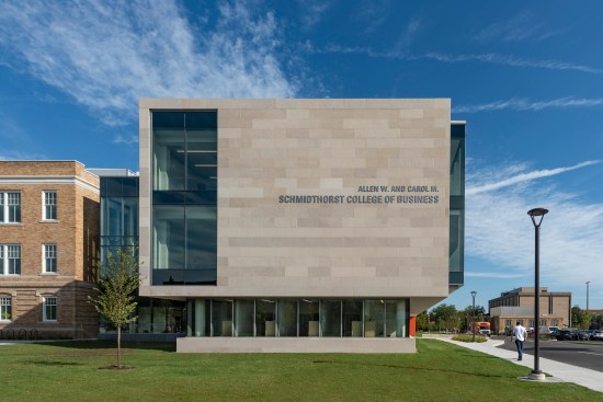 Vertical circulation through the atrium is via a terraced stair between the first and second floors and a smaller sculptural stair between the second and third. A three-story limestone-clad tower houses the elevators, and is outfitted with LED “ticker tapes” that provide information about the market, breaking news, and even the dean’s Twitter feed.
