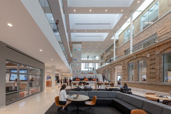The design team intended the addition to maintain a certain continuity with the historic Hanna Hall: They used similar brick, limestone, and glass for the new building, matched the three-story height of the older structure, and in increasing the footprint of the new center, respected the symmetry of the original hall. The center’s signature space is a three-story-tall atrium that spotlights Hanna Hall’s rear façade as the dominant feature. But the overall articulation of the addition, even if defers in some ways to the historic building, stands in sharp contrast the modest and classically inspired forms of the original.