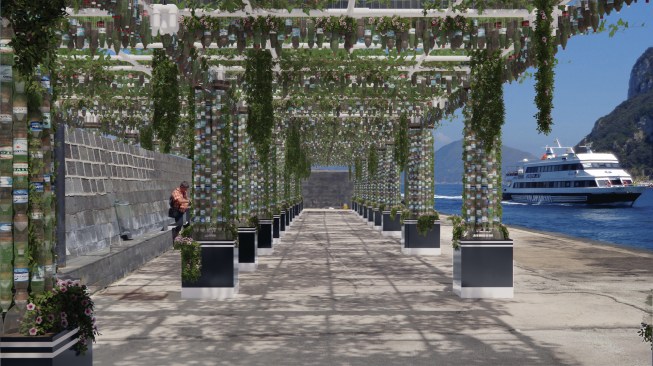 Not all the participants gave into the seduction of a computer-based analogy to the visions of a sun-blessed island retreat. Dylan Pero, who works alongside Schleiff and Quittenton at Sauerbruch Hutton, produced a concrete proposal to extend the colonnades that border so many gardens and porches on Capri to public spaces, providing shade and definition to the area where passengers wait for the ferry boats to arrive. He developed an intricate method of reusing trash, both on the island and off its shore, and growing columns out of native plants while finally also selling the results in postcard visions. Meanwhile, Virginia Tech assistant professor Nero Chenxuan He concentrated on the construction of the visual fantasies themselves, proposing a modern-day camera obscura, constructed out of the scaffolding that surrounds so many structures under renovation on Capri, that would let inhabitants see a reversed and perfected version of the island.