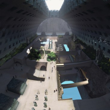 This underground world became vast in the imagining of Richard Quittenton, also of Sauerbruch Hutton. Taking off on the presence of caves throughout Capri, including the famous Blue Grotto, and the baths the Romans built, Quittenton prompted Midjourney to create a complete subterranean world where the equally underground population of restaurant and hotel workers, delivery people, and other seasonal staff could live and play. Accessed through the back of some of the luxury goods stores that line Capri’s main streets, this world would both accommodate those workers, who are often crammed together in bunkhouses hidden along the same back alleys Schleiff explored, and give them their own fantasy retreat.