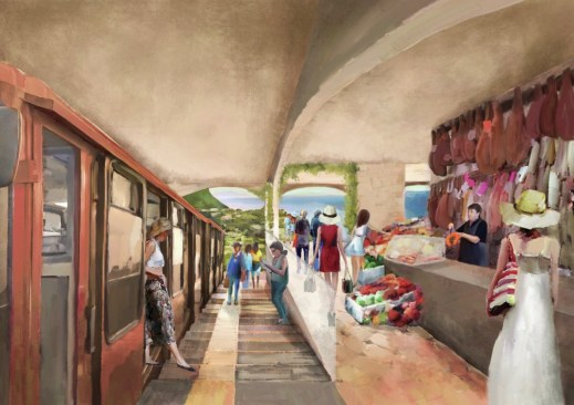 Nelson Schleiff, of the Berlin architecture firm Sauerbruch Hutton, took as his starting point the funicular that transports both tourists and locals from the main ferry, yacht, and fishing boat harbor up to the piazzetta. Ultimately eschewing Midjourney for what he calls “old school” hand-drawing techniques, he proposed several new stops along this eight-minute ride that might seduce visitors to sample local crafts and produce while providing residents with services—ranging from hardware stores to medical clinics—that are currently hard to find. These new spaces, hewn into the island’s rock, would then connect to a notional excavation of the Roman ruins that in fact exist under much of the town of Capri. Stores and bars intended only for the locals and initiates would continue the hangouts the workshop participants discovered during their stay there, hidden in back alleys or appearing in the private spaces of workers.