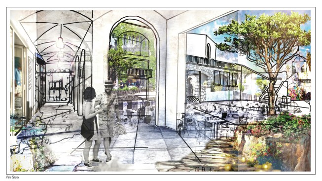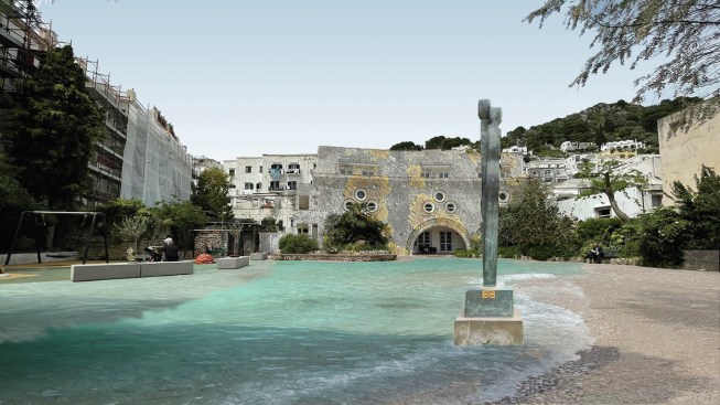 What the Capri 2.0 workshop produced was such strangely familiar imagery. The proposals ranged from the modest to the fairytale, although those two extremes seemed to also, courtesy of the computer’s mystical workings, become intertwined. Michele Yeeles, a designer based in Palm Springs, Calif., and Wellfleet, Mass., focused on a neglected community square and adjacent public tennis courts in the heart of the little town, evoking some of the artwork and fountains that had once been there and extending them into a system of water features. These rills and pools would make fresh water—what is on any island a precious commodity, but to which citizens here have much less access because of the cliffs that dominate Capri’s edges—central to the island’s life. Combining the impressionistic style in which the local tourist bureau likes to present the place with painter David Hockney’s vision of swimming pools in an equally mythic Southern California sybaritic landscape, Yeeles’s images make it seem as if the new scenery is already in place.