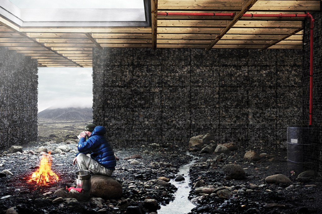 A recent contest, launched by competition-organizing company Bee Breeders with CDS NORD Property Developers, called for a shelter distilled to its most basic functions—a place to rest, relax, and rejuvenate—designed for hikers navigating isolated Icelandic landscapes. Toronto studio Origins designed the first-place entry, the three-roomed Terra Firma, articulated with gabion walls filled with local volcanic stone. A 3,500-square-foot timber and polycarbonate roof covers two sleeping areas as well as interior and exterior gathering spaces. CDS NORD plans to construct the first Iceland Trekking Cabin, which could be any of the top three winners, next year.