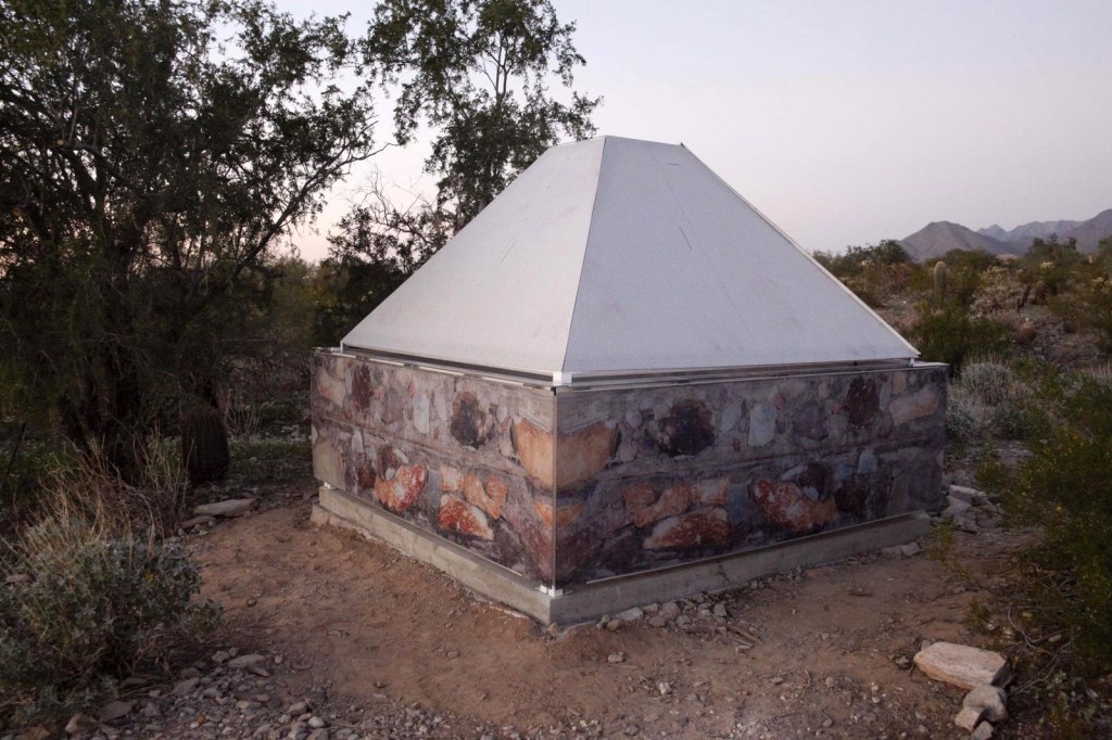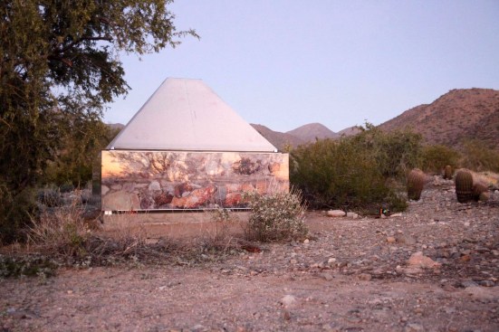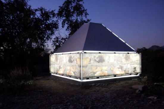 At The effect is one of estrangement, as you have to struggle to make sense of this reverse facsimile, in which materials, textures, and qualities have become transposed. But Site:168 has more to offer than its initial sight gag. During the day, the base gleams; at night it glows. The structure is thus a little bit of the city that surrounds Taliesin West on three sides brought onto the campus. The “tent,” meanwhile, fades into the sky, both day and night. From the inside, you have the experience of light coming up from the bottom instead of the top. Small slits between base and top give you views of the surrounding desert in an exaggerated version of the low, horizontal windows of which Wright was so fond.