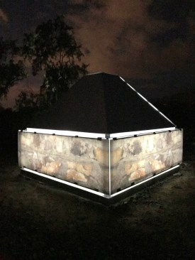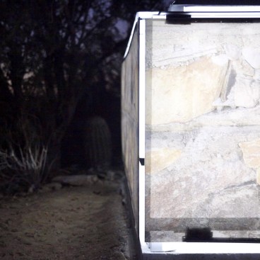 When you come up to Site:168 (a name Quittenton chose precisely because it means nothing but sounds very specific and even slightly ominous), you think you are seeing a new version of the traditional shelter: a square masonry base on which the pyramid of canvas tent perches. As you come closer, however, you realize that something is off. The masonry is shiny, while the canvas is hard. It turns out that the base consists of plexiglass plates on which Quittenton printed digitally manipulated photographs of desert masonry walls on campus. The tent consists of metal plates printed with an exaggerated canvas pattern. What appears to be solid and obscure is light and translucent while what should be gauzy and translucent is heavy and opaque.