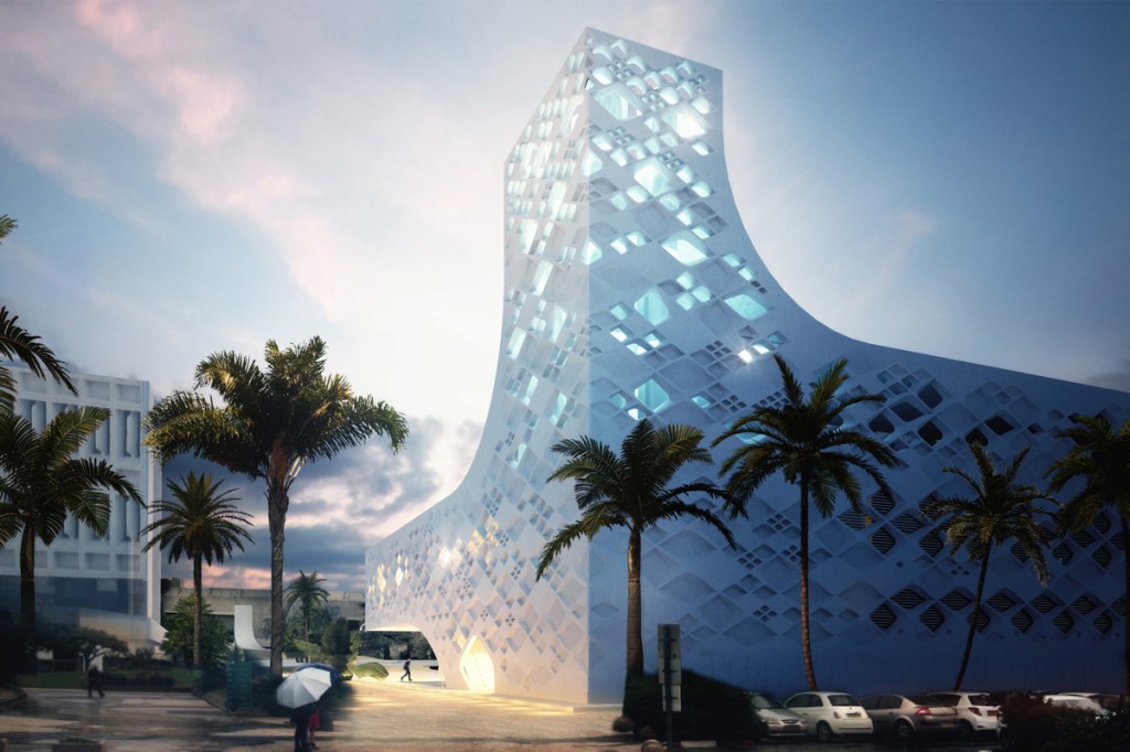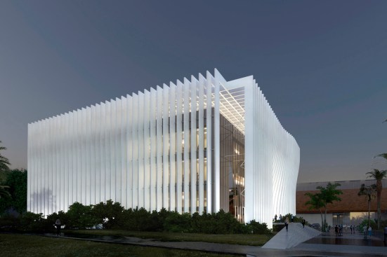 Inspired by the Holliday Junction parallelogram—a cross-shaped structure that forms during genetic recombination used in DNA nanotechnology—this mostly horizontal building slopes upwards into a chimney at its east entrance. A white glass-fiber façade will be backed by reinforced concrete rainscreen panels that have a stippled surface finish.