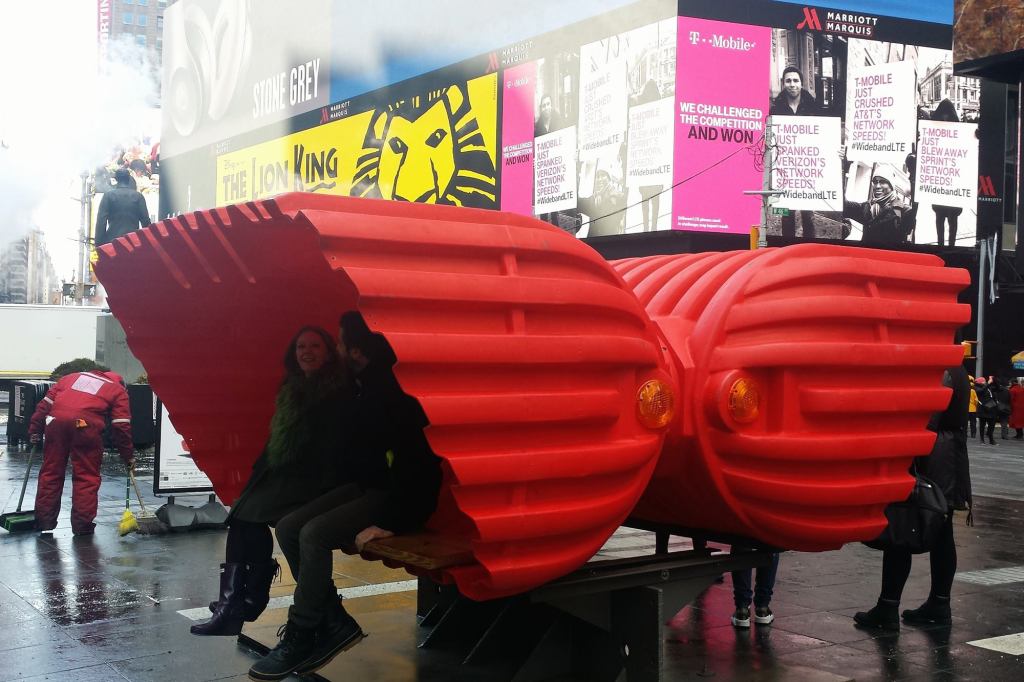 As drugstores sell off the last of their heart-shaped candy stock, the Times Square Valentine Heart is closing too. This year’s heart-shaped installation, called “HeartBeat,” was designed by Brooklyn’s Stereotank and opened last month in New York City’s Father Duffy Square. But it’s not leaving without a surprise. Last week, Times Square Arts—the program behind the annual installation, now in its seventh year—announced that “HeartBeat” was going to become “HeartSeat” for its final week on Times Square. Times Square Arts partnered with the Architectural League of New York for this year’s installation.