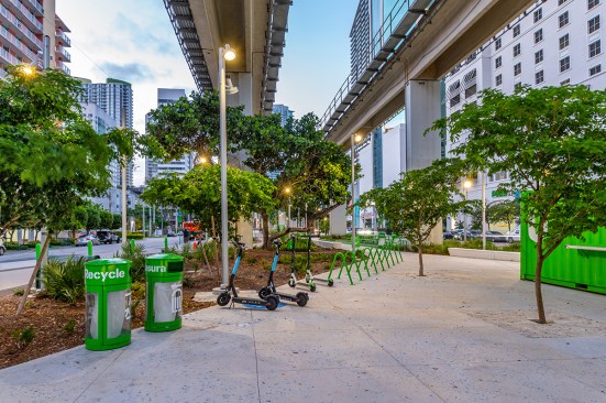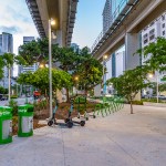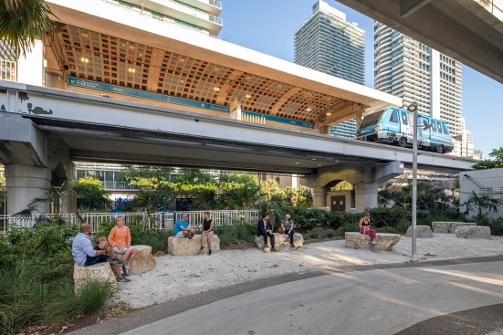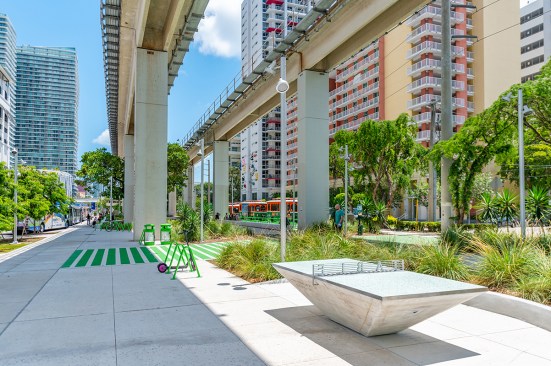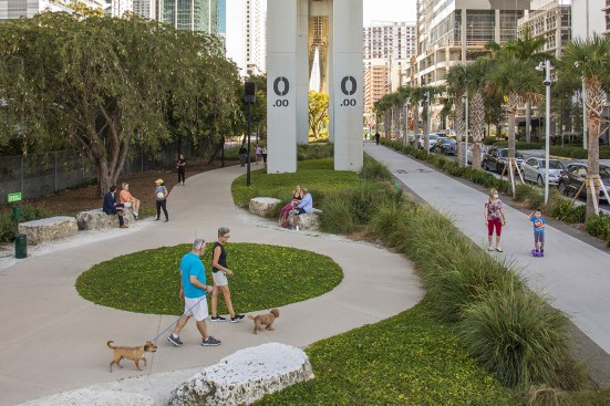 The phase’s River Room section offers views of the Miami River and city skyline, providing residents of the Brickell neighborhood a connection to the river and a quiet, contemplative space for respite. The active Urban Gym offers a variety of physical activities, from yoga to basketball. The two-block-long Promenade is one of the busiest spots in the park. Filled with pedestrian commuters entering the Metrorail station on one side of the Promenade, a series of social spaces keeps this area bustling. The Oolite Room pays homage to the limestone geography of the region. Coral stone outcroppings and garden areas define this space as one for strolling, relaxing, and enjoying nature. A bike trail and pedestrian path connect these four distinct zones.