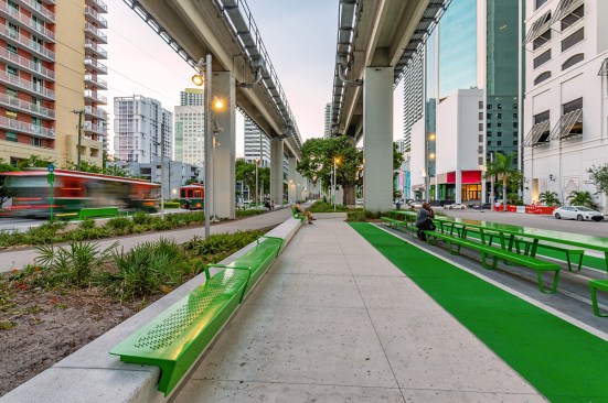Landscape Forms’ in-house lighting team developed several custom elements for Arne light application, including poles that meet clearance codes and can withstand Miami’s climate. “Arne lighting is one of our favorite site elements,” Field Operations’ principal Isabel Castilla explains the unique role the lights play in the park. “The Underline is flat. There are no canopy spaces, few tree plantings, nothing that could impede the trains running above. The light poles are the only vertical element in the park. They are functional and beautiful, and they’ve become something iconic within the park,” she says. “Arne gave us one vocabulary and an extremely successful fixture that is versatile but also uniform in its design.”