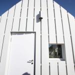 Reclaimed barn siding configured in a simple plank pattern graces the outside of the dwelling. A peaked, standing-seam metal roof completes the structure; solar panels do not require mounts that could distract from the roof’s profile.
