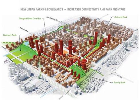 The Central Business District in Beijing needs to expand in order to accommodate a robust market for new commercial and industrial space as well as arts and cultural facilities. The 1.2-square-mile site was designed to accommodate future growth while implementing sustainable systems—such as advanced public transportation and infrastructure with smart-technology-controlled utilities—that ensure a large-scale, low-carbon development with a vast network of open space, parks, and green boulevards.