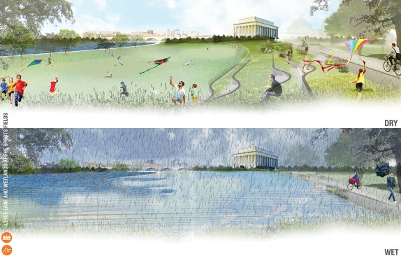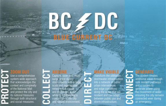 Blue Current DC, an entry from CallisonRTKL, was announced as the winner of the National Treasures Design Competition held by the Washington, D.C. chapter of Open Architecture Collaborative (OAC|DC) last week. OAC|DC’s goal in hosting the open ideas competition was to promote storm surge mitigation techniques in D.C.’s Tidal Basin region as a response to the increasing frequency of storm flooding events locally and nationally. Selected finalists presented their proposals in Pecha Kucha format on August 18, with CallisonRTKL’s Blue Current DC entry winning the competition with its use of protective levees that would encircle the low-lying western end of the National Mall, from the Washington Monument to the Lincoln Memorial, and southward surround the Tidal Basin and Jefferson Memorial.