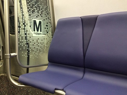 The exterior of these new stainless steel cars, built by Kawasaki, look somewhat like a subway’s answer to an Airstream trailer. The burnt orange and red warm colors seen in so many of Metro’s existing cars are gone, replaced by cool blue vinyl color-blocked seats and black nonslip resilient flooring speckled in a subtly patriotic red, white, and blue. A Metro press release describes the new aesthetic as a “customer-preferred blue and grey interior color scheme.”
