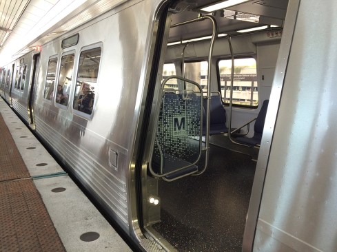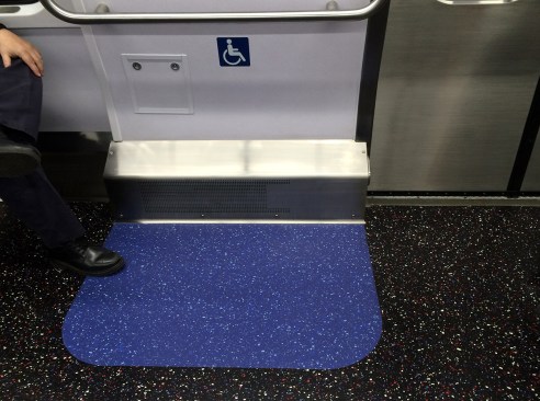 The new cars also include various visual station alerts near the doors, above the center-facing seats, and along the aisles, as well as digital audio announcements. Spaces for wheelchairs are called out by obvious blue flooring near the doors.