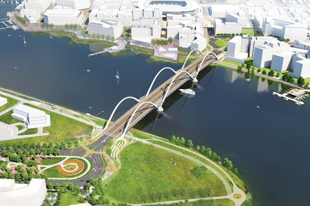 Construction of the three-arched bridge is slated to begin this winter—with a projected completion in late 2021—and will be executed in two phases with a budget of $441 million. The first phase of the project will be executed by AECOM as lead designer, with Archer Western Construction and Granite Construction Company. Additional elements include new traffic circles on each riverbank, improved storm and drainage infrastructure, and increased pedestrian and bicycle accessibility. The city attained special permission from the Federal Highway Administration to ensure 51 percent of new jobs related to the project are performed by D.C. residents.