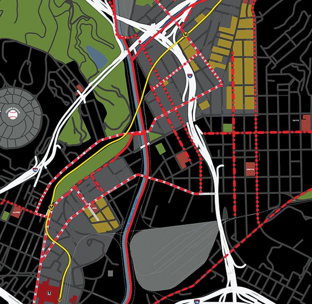 In the case of Making the Connections (above), this means reworking the streets in Los Angeles’ Lincoln/Cypress and Ann Street neighborhoods to encourage walking and biking to nearby Metro Gold Line stations. (The red lines and dashes denote a proposed bicycle network.) The plan ties into housing development spurred by the new transit hub, a revitalization plan for the Los Angeles River, and the Los Angeles State Historic Park. By paying attention to details like street trees, green medians, and sidewalk plantings, Fletcher is able to control urban ecology issues such as how stormwater percolates back into the watershed.