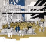 Street-level rendering, showing pedestrian bridges and parking.