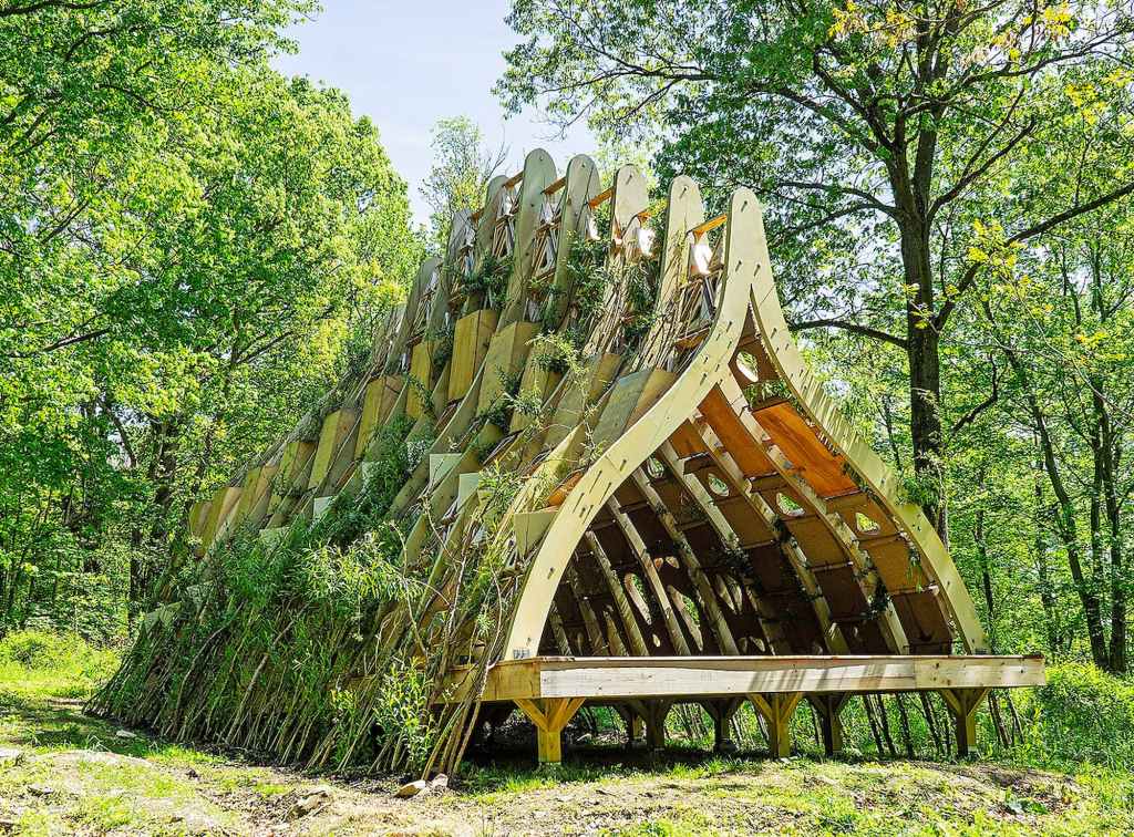Contemporary land artists and architects have explored the possibilities of working with living media to create shelter. Italian artist Giuliano Mauri “grew” a vegetal cathedral by planting and training beech trees to mimic the columns and vaults of Gothic architecture. Sculptor Patrick Dougherty has constructed various occupiable structures made from tree saplings, including living specimens. Architect Marcel Kalberer crafted the Auerworld Palace in Auerstedt, Germany, using willow trees guided to form a dome shape. Terreform One constructed the Fab Tree Hab in New Windsor, NY, using a CLT scaffold as formwork for grafted trees.