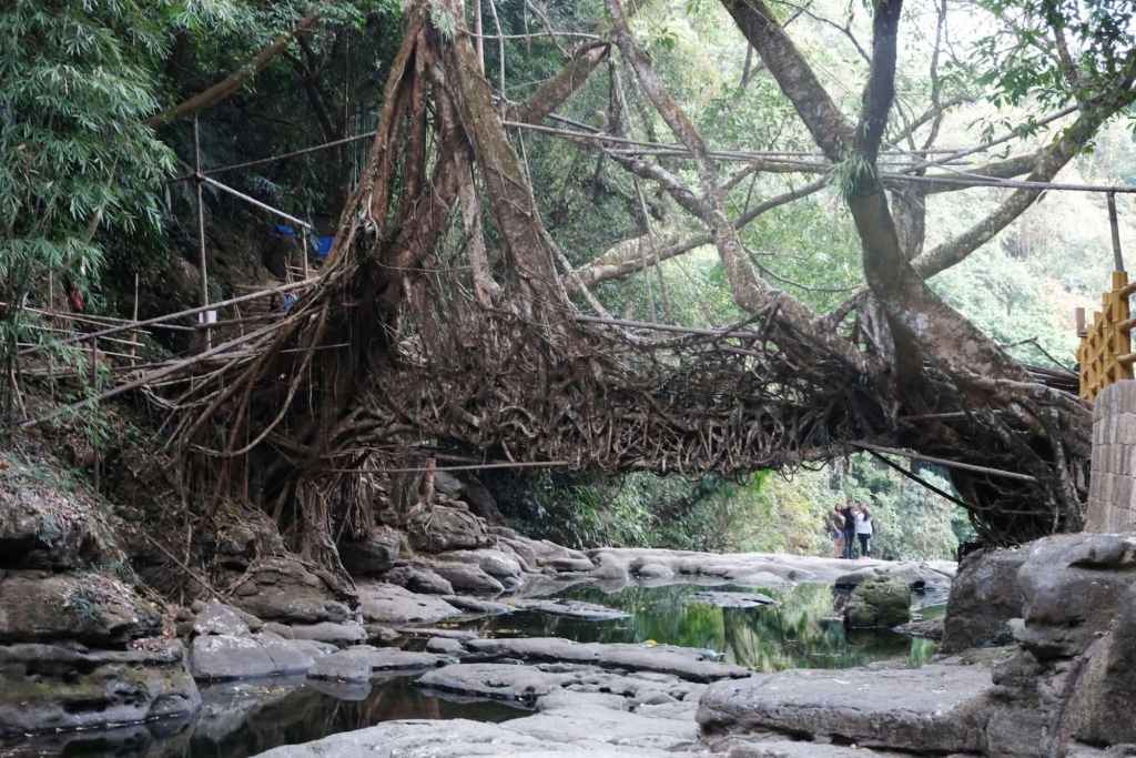 The idea of literal living structures is not new. The indigenous Khasi and Jaintia tribes have long crafted living root bridges in northeast India by directing the aerial roots of rubber fig trees across rivers and streams. The roots become more durable over time, anchoring the surrounding soil while the trees continue absorbing CO2 and providing habitat for multiple species. Other living structure precedents include the Native American bentwood structures formed with living saplings and the tree platforms and bridges constructed by the Korowai people in the forests of Papua New Guinea.