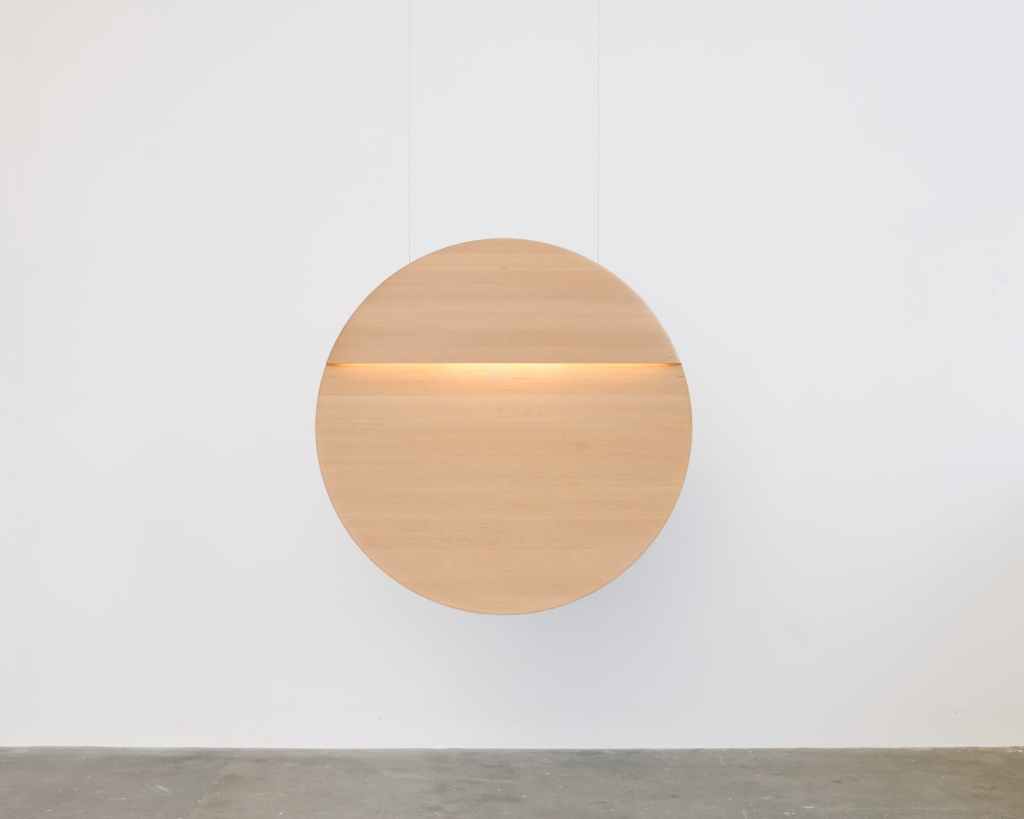 A suspended circular light made of Oregon pine, steel, and LEDs, Ray evokes sunbeams and the transport systems within wood. The designers draw on Japanese uzukuri brushing to reveal growth rings, blending scientific research with poetic form.