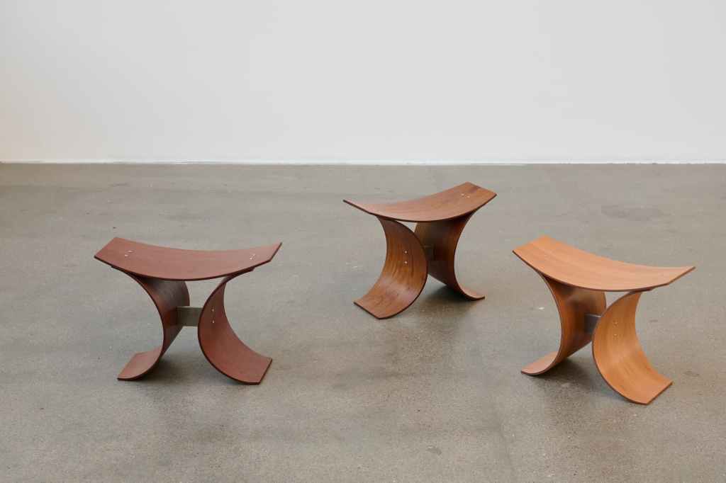 Crafted from pressure-molded veneer layers joined by a steel bracket, Vester’s stools show how industrial processes like lamination can generate both efficiency and expressive sculptural qualities.