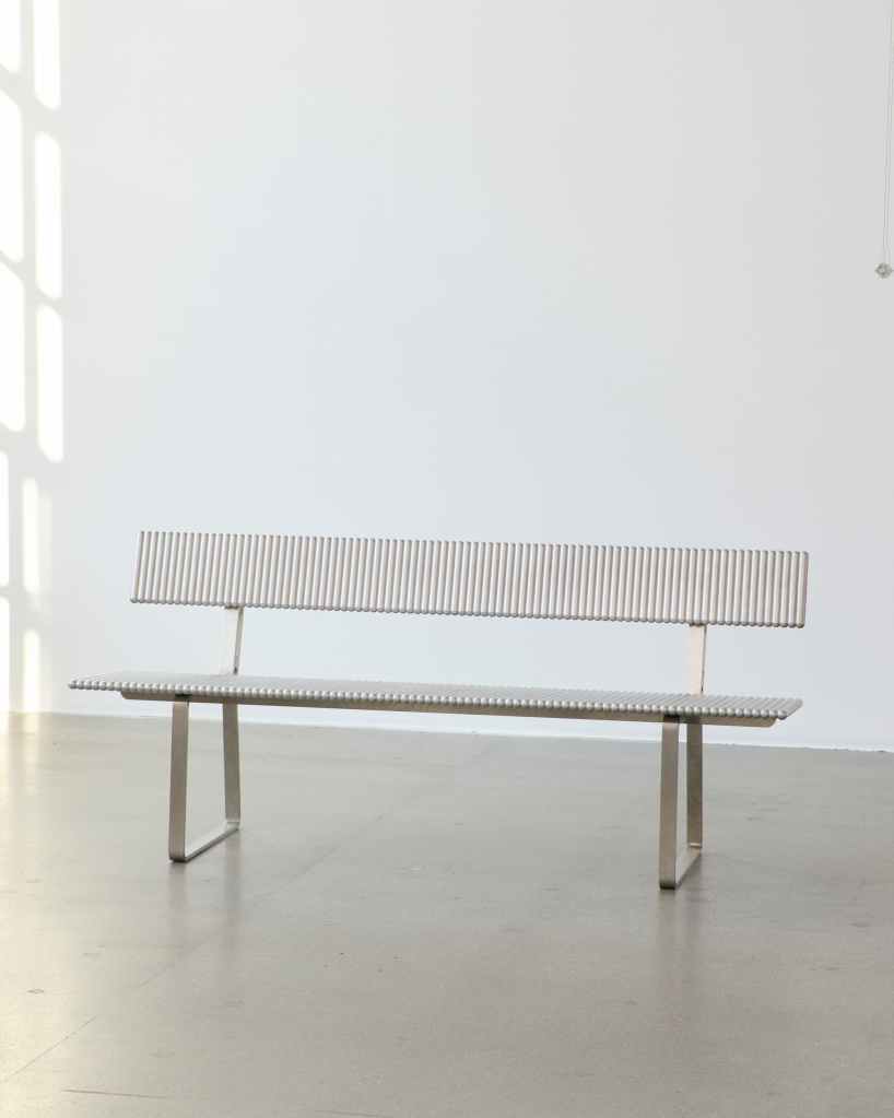 Kjeldgaard contrasts the heaviness of milled aluminum rods in The Bench with the suspended lightness of Small Ones. His work explores balance, repetition, and the fine line between stability and fragility.