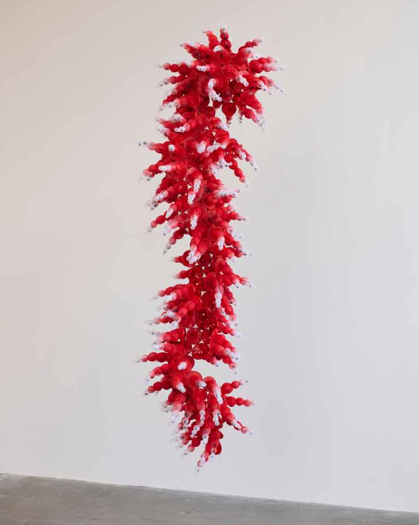 Textile-based sculptural works using shibori, digital print, and heat-setting techniques, Lillelund’s suspended pieces mimic natural organisms. Silk and polyester organza respond differently to light and movement, creating dynamic, quasi-living forms.