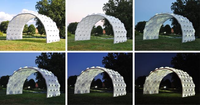 The 3D-printed structure is composed of modules that capture and store solar energy, and can be used at night to illuminate the pavilion based on the day's environmental conditions.