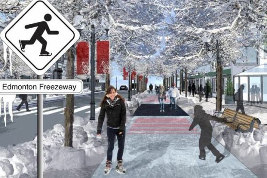 The Freezeway, a concept crystallized by a landscape architect’s master thesis, is a proposal to make a 6.8-mile skating lane in Canada to provide an alternative mode of transportation and encourage residents to embrace the arctic climate.