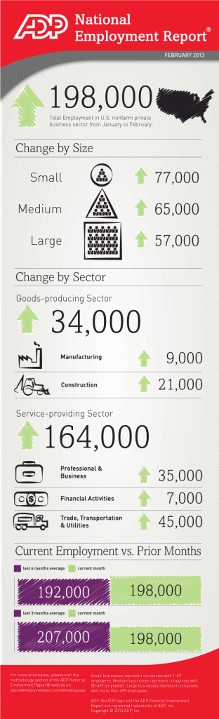 Automatic Data Processing (ADP), a leading provider of payroll services, has released its February employment report, a report that it creates each month in association with Moody’s Analytics. According to their calculations, the national economy added 198,000 jobs (from nonfarm private employers) in February 2013. January’s job totals were also revised upward by 23,000 jobs, from 192,000 jobs added to 215,000.