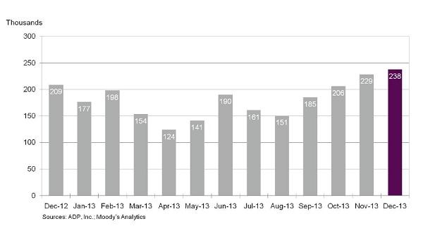 According to the report released today by payroll company ADP and Moody’s Analytics, the U.S. nonfarm private sector added 238,000 jobs in December. This is the strongest job growth for any month in 2013, surpassing November’s high of 229,000, which ADP initially reported as 215,000.