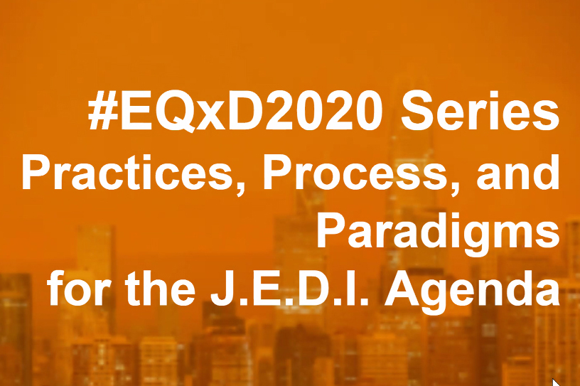 The committeeâs sixth symposium, EQxD 2020: Reflect, Restructure, Recalibrate, opened yesterday with an interactive presentation, kicking off a five-month-long series of virtual meetings and workshops that will ârequire an increased level of engagement and dialogue,â says Sheng, who is also a principal and the director of equity, diversity, and inclusion at SmithGroup. âThe series is exploratory in the format beyond a traditional panel session. It requires attendees to roll up their sleeves and do the work as part of the collective learning that we all need to do to advance justice, equity, diversity, and inclusion (JEDI) in the built environment.â