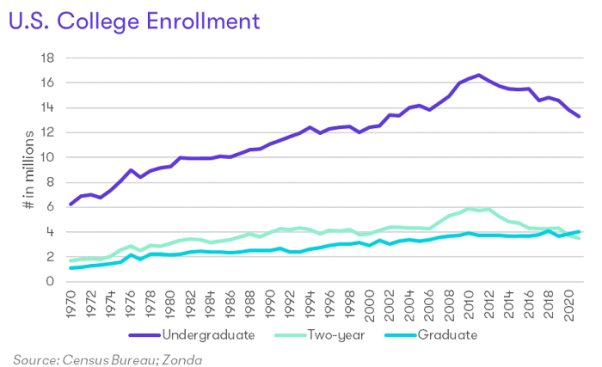 College enrollment isn’t a clear reason either. The Census Bureau’s latest data shows that college enrollment is still below pre-pandemic levels. Notice that undergraduate and two-year college enrollments are down significantly from their respective peaks in the 2010s, although graduate enrollments have been steady and even increased slightly.