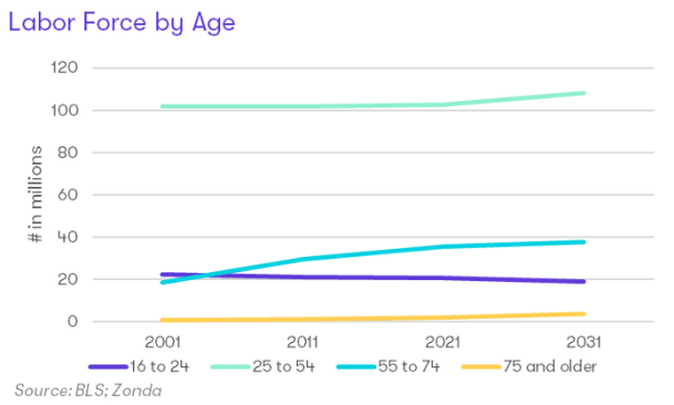 More systemic, though, is the fact that by 2030, all baby boomers will be of retirement age. This will lead to additional pressure on the labor force as the overall workforce ages and the generation behind them, the Gen Xers, are smaller in terms of sheer size.