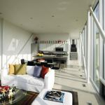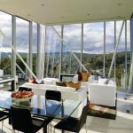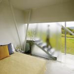 In plan, the building is surprisingly down-to-earth. “I always use the analogy of a Pullman car,” Schwartz says. “The rooms are on the right, and the corridor is on the left.” The corridor descends three sets of folded-steel stairs, passing three bedrooms and a separate staircase to the roof deck, each of which occupies its own concrete landing. The elevated entry provides a preview of the vista that wraps the airborne great room.