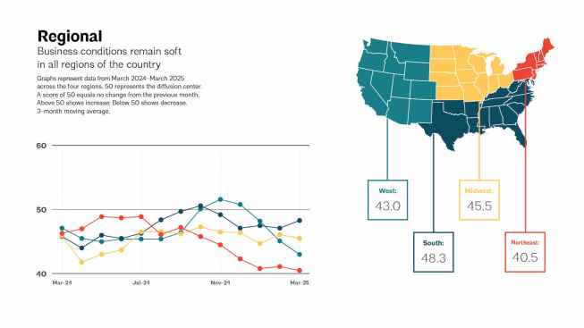 All figures below 50 indicate a decline in activity, and while regional and sector-specific numbers provide some nuance, the overall national picture suggests persistent caution and stalled momentum.