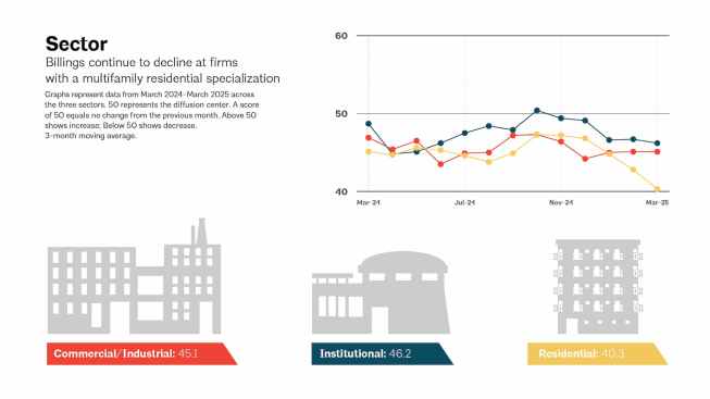 Despite the gloom in billings, some firms may find stability in existing workloads. A 6.5-month average backlog offers temporary insulation from further economic shockwaves, but signs of future work remain weak across the board.