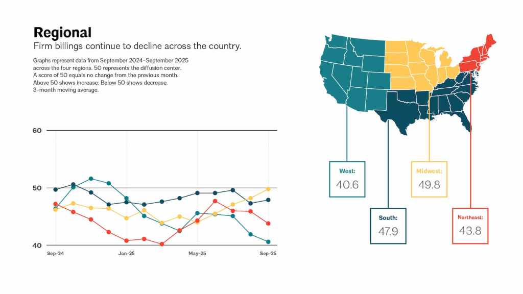 After months of optimism that the slowdown in design work might finally stabilize, September’s AIA/Deltek Architecture Billings Index (ABI) delivered a sobering message: the industry’s headwinds are far from over.