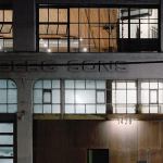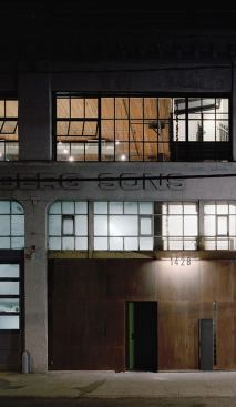 The mild steel-clad entryway of the old building, a former shoe parts warehouse, blends with the transitional neighborhood.