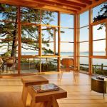 Floor-to-ceiling wood windows maximize water views from the living room.