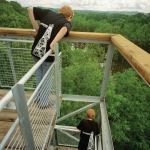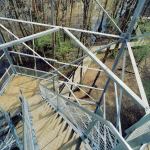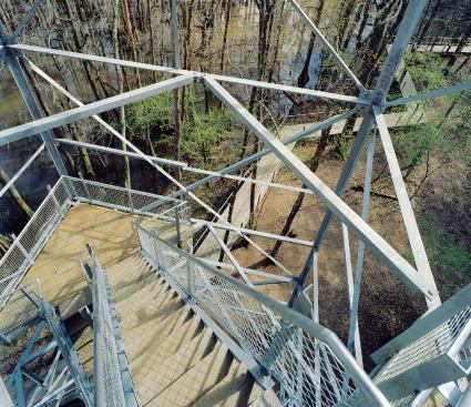 Following the advice of structural consultants Joe Farruggia and Anderson Inge, the students decided to place the tower on helical anchors because of limited access to the wooded site. They also designed and built a 270-foot-long boardwalk that approaches the tower along the edge of a cypress swamp. The boardwalk ate up much of their budget, requiring them to raise another $20,000.