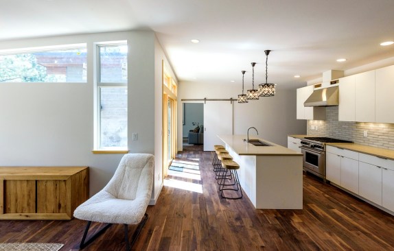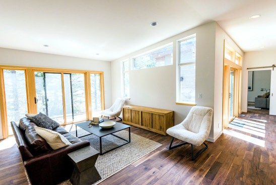 Once the modules were completed and shipped to the site, cranes set the pieces in place and the Mark Tanner team installed electric, plumbing, gas, and auxiliary items, such as exterior decks. Inside, the homes boast mountain modern décor, hardwood floors, custom cabinetry, and energy-efficient features standard in California homes.