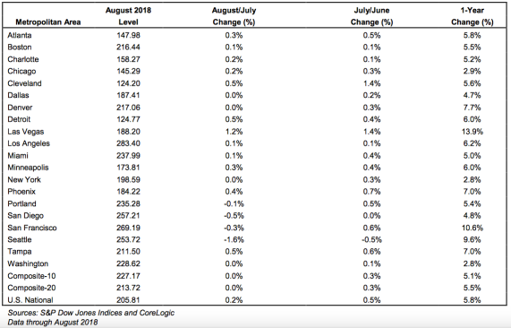 Las Vegas, San Francisco and Seattle reported the highest year-over-year gains among the 20 cities. In August, Las Vegas led the way with a 13.9% year-over-year price increase, followed by San Francisco with a 10.6% increase and Seattle with a 9.6% increase. Four of the 20 cities reported greater price increases in the year ending August 2018 versus the year ending July 2018.