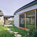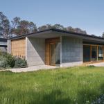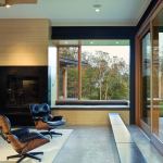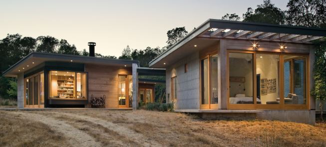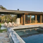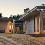 Glazing in the main living pavilion is oriented for solar gain and views of the surrounding Madrone forest.