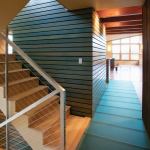 Inside the Johnson house, salvaged fir slats echo the exterior siding, and glass panels on the floor transmit light to a hallway below.